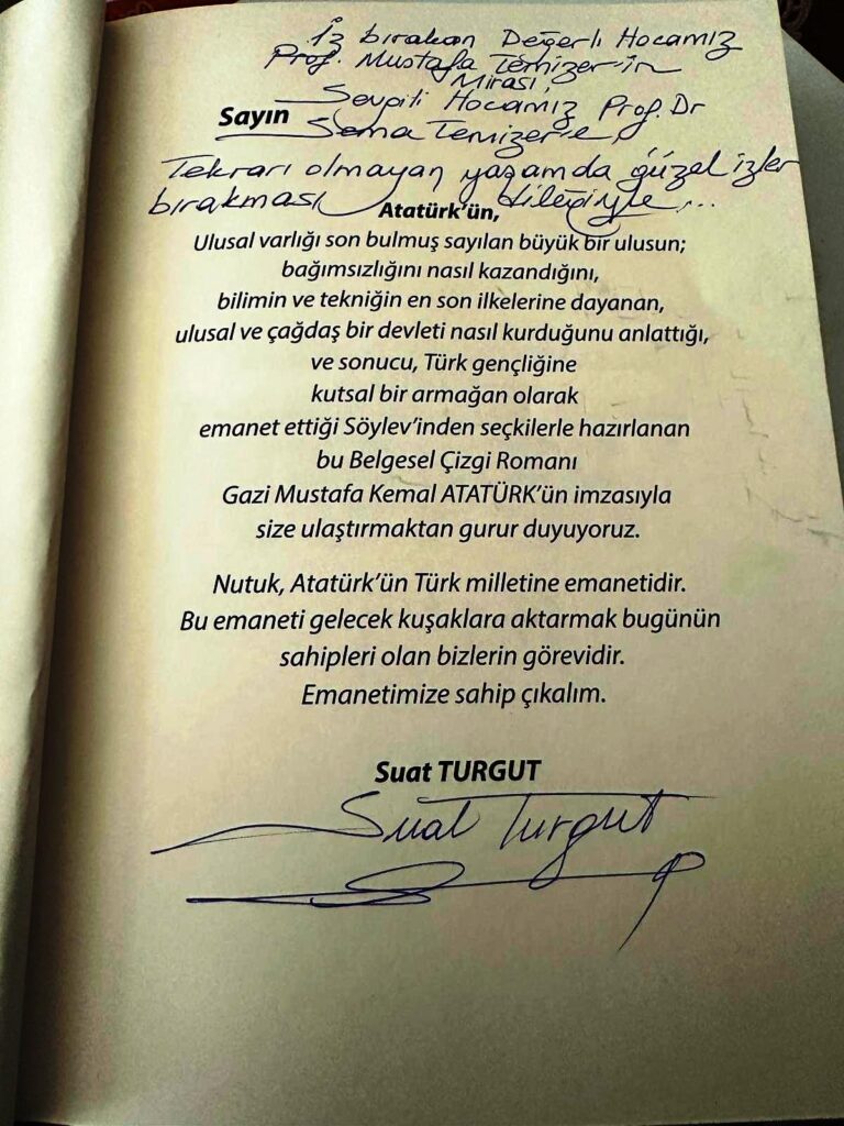 Çizgilerle Atatürk Dönemi “NUTUK” un bir nüshasını şahsıma imzalayarak takdim eden kıymetli yazara çok teşekkür ediyor, kendilerini kutluyor ve çalışmalarında başarılar diliyorum.